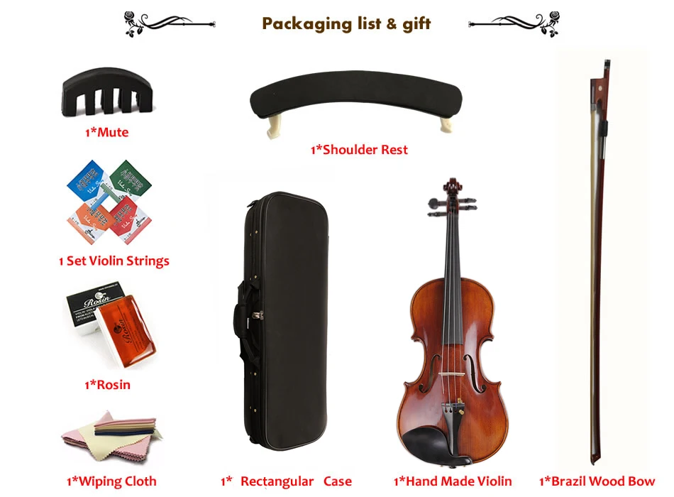 1 * скрипичный бант; 1 * плечевой упор; 1 * канифоль; 1 * скрипка ручной работы; 1 * бесшумный; 1 * прямоугольный чехол; 4 * скрипичные струны; 1 * протирочная ткань.