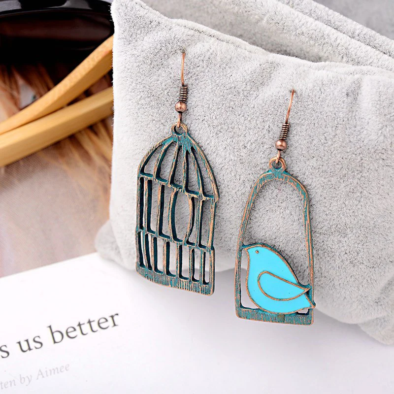 Уникальный дизайн синяя птица в клетке подвеска в виде животного серьги женские металлические бронзовые хиппи серьги праздничные подарки ювелирные изделия для ушей