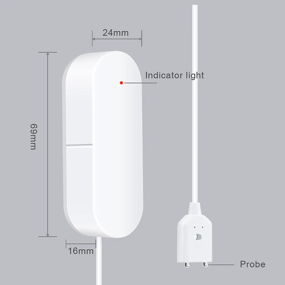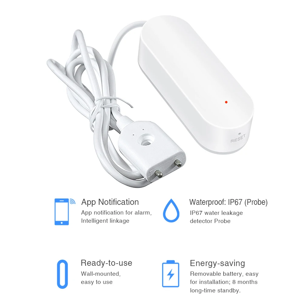 Особенности: Управление мобильным приложением, подключенное к сети через wifi, дистанционное управление в любое время, вы получите уведомление, если есть утечка. IP67 водонепроницаемый датчик утечки воды. Настенный, простой в использовании. Съемный аккумулятор, простота установки, низкое энергопотребление, энергосбережение. Голосовое управление не поддерживается. Нет местная сигнализация. Вы можете поделиться устройством с семьей.