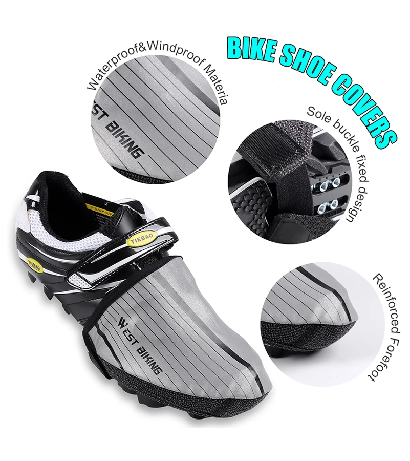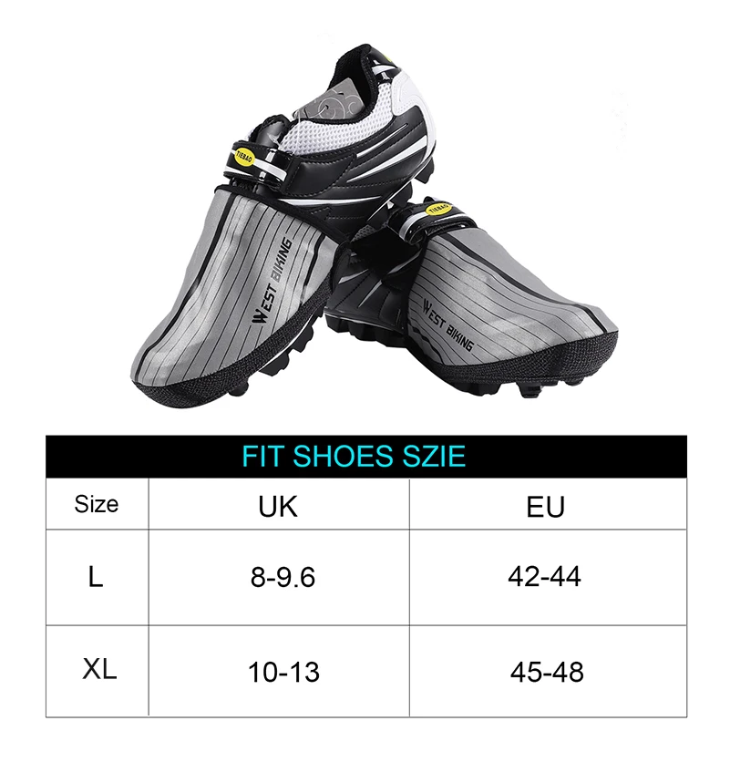 Информация о продукте Бренд: WEST BIKING Название: водонепроницаемая велосипедная обувь Материал: Светоотражающая эластичная ткань; Износостойкий материал Вес нетто: около 43 г/пара Цвет: черный/серебристый Размер: L (Великобритания 8-9,6; ЕС 42-44) XL (Великобритания 10-13; ЕС 45-48) Особенности: водонепроницаемый, ветрозащитный, эластичный материал