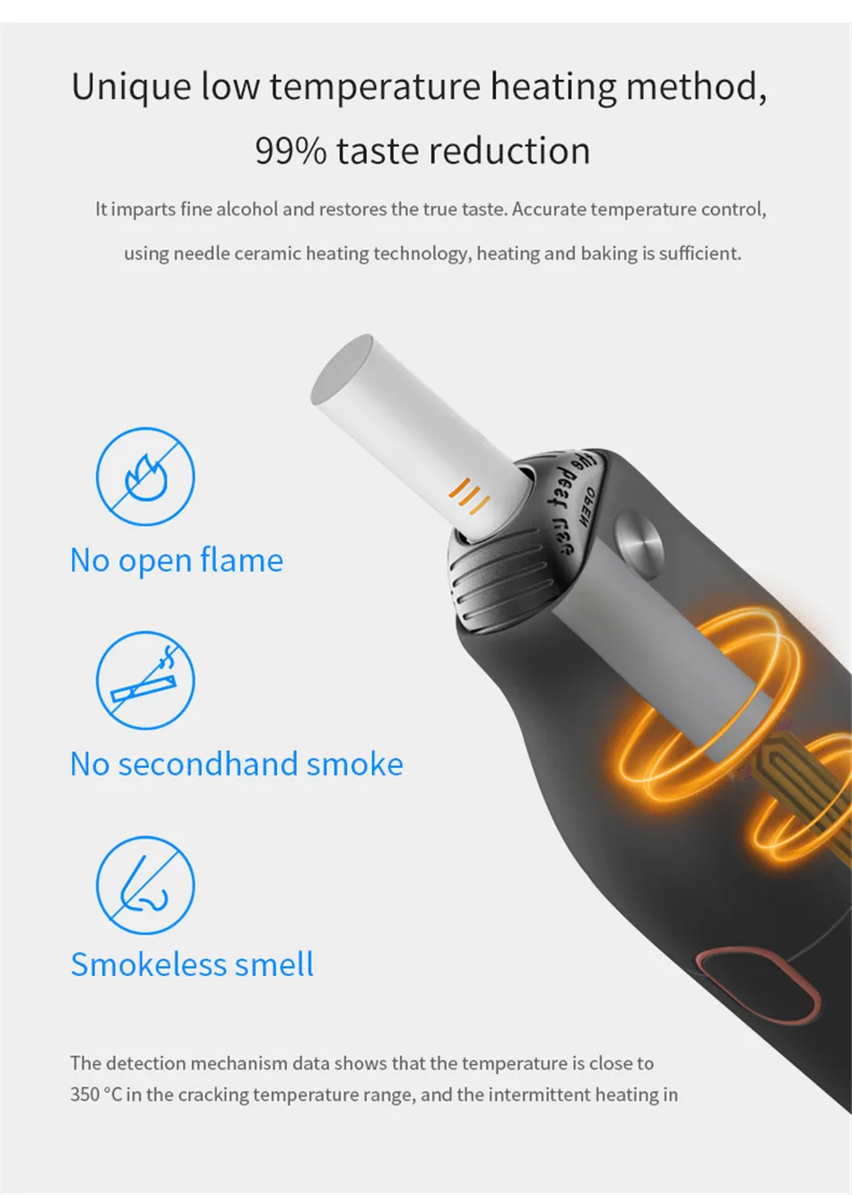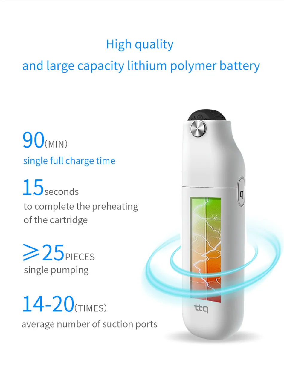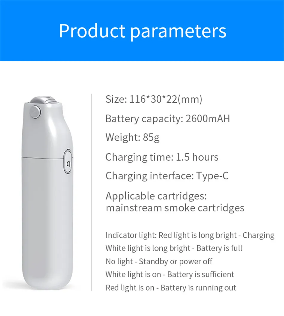 Общий вес 85 г Режим зарядки type-C Время зарядки: 1,5 часов Контроль постоянной температуры нагрева цилиндра Функция защиты Защита от короткого замыкания Защита от избыточного заряда защита от избыточного разряда защита от низкого напряжения Защита от температуры Аккумулятор емкостью 2600 мАч Количество разрешенных сигарет-25