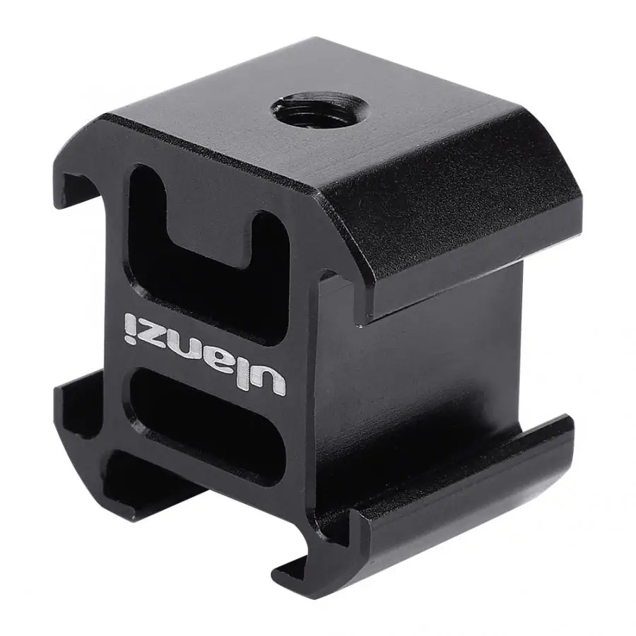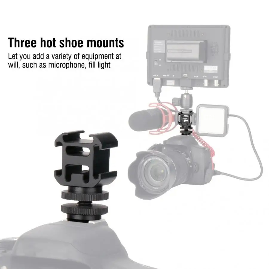 Принимает Высший сорт алюминиевого сплава, точность обработки CNC, Это крепление является прочным, тяжелым и прочным. Он оснащен тремя креплениями для горячего башмака, позволяющими вам по желанию добавить различные устройства, такие как микрофон, заполняющий свет и т. д. Нижняя часть является универсальным креплением для горячего башмака, совместимым со всеми брендами камеры.