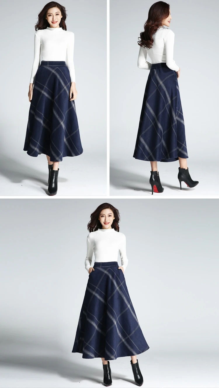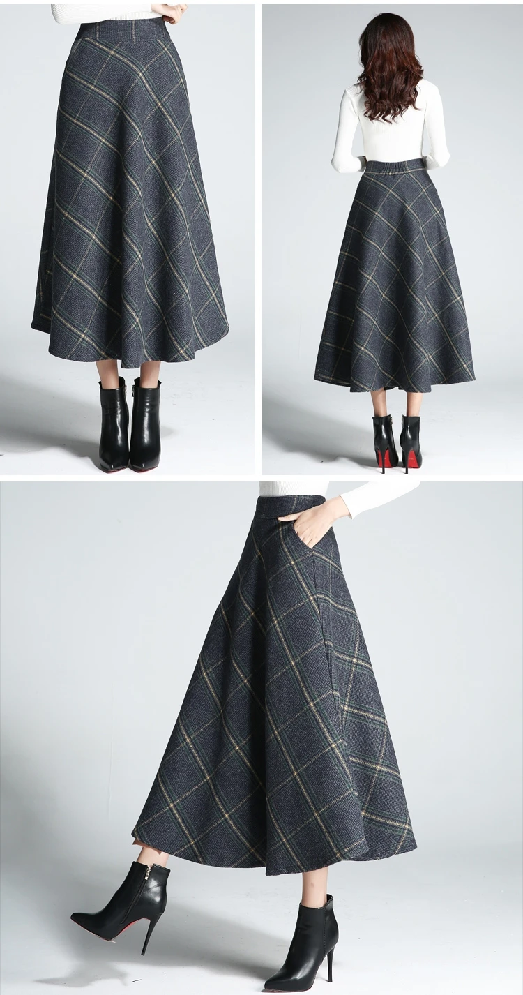 Осень-зима 2020, винтажная шерстяная юбка, элегантная, для девушек, тонкая, а-силуэт, высокая талия, толстая, Свинг, макси, длинная, в клетку, юбки с поясом DF922 <