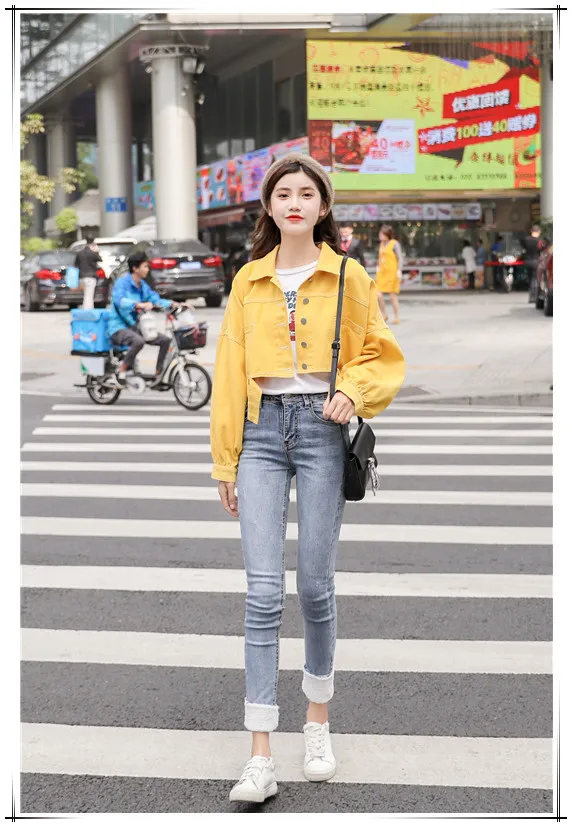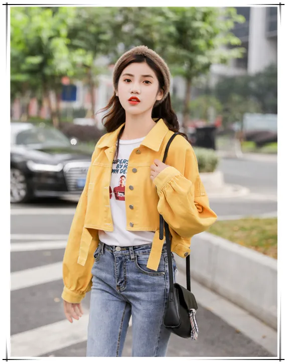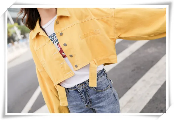 Укороченная куртка Для женщин с длинными рукавами джинсовая куртка-бомбер свободные Однобортный джинсовые куртки женская обувь красного цвета с Yel1 белые пуховые пальто куртка DV989