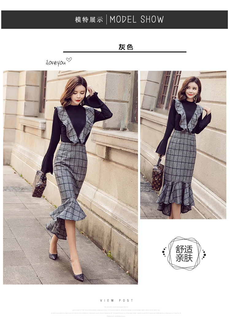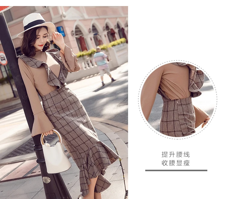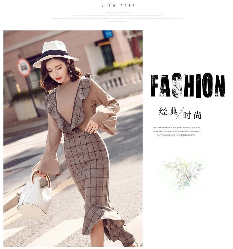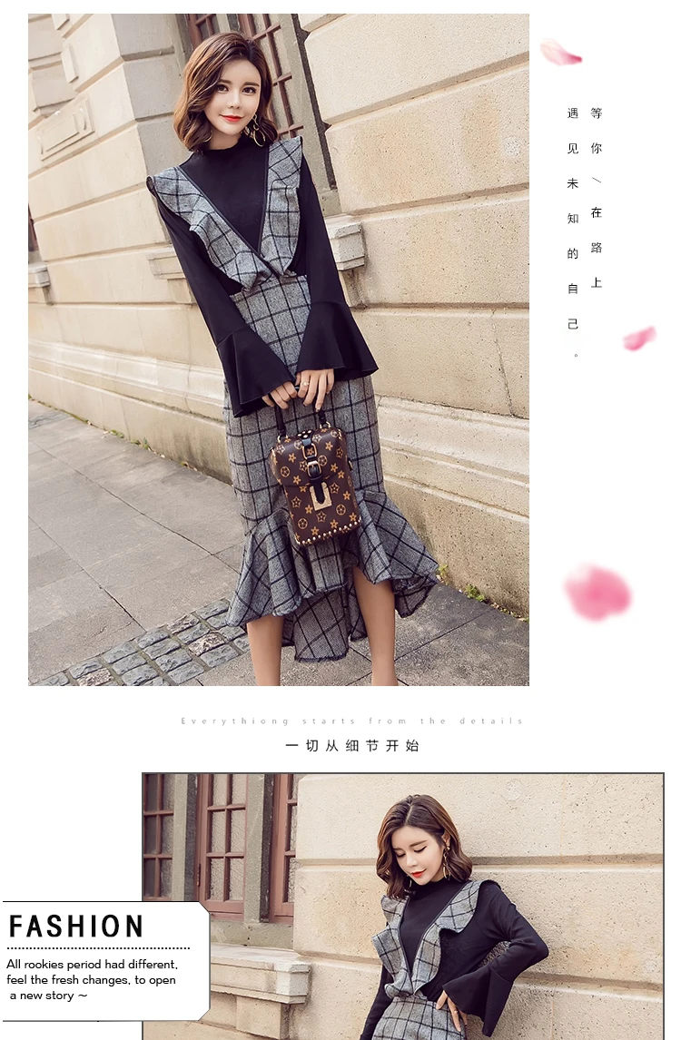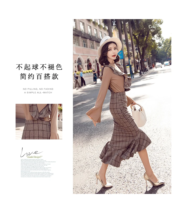 2020 Весна Высокое качество Новые Подиумные Женские топы с расклешенными рукавами + Женский комплект 2 шт. клетчатое платье с рыбьим хвостом DC843 <