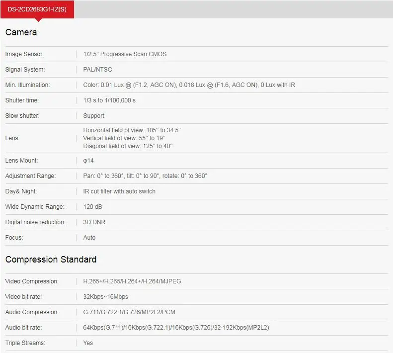 • Цвет: 0,01 Lux @ (F1.2, AGC ON), 0,018 Lux @ (F1.6, AGC ON), 0 Люкс с ИК