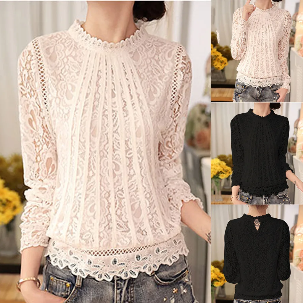 Женская Осенняя Кружевная футболка с длинным рукавом, блузка, пуловер с высоким воротом, свободная