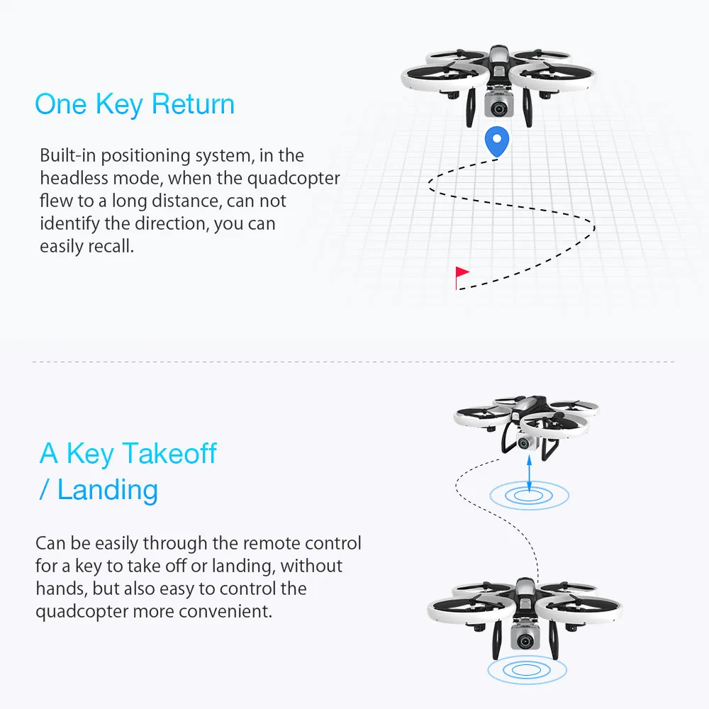 -Один ключ взлета/посадки. Одно нажатие автоматически снимает или садится, Дрон снимет или возвращается в положение, где он снимал.
