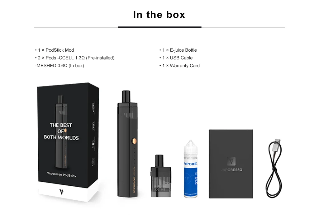 1 x PodStick комплект 2 x Pods-CCELL 1.3ohm (предустановленный), сетчатый 0.6ohm (в коробке) 1 х Бутылка для электронных соков USB кабель (1 шт.); Руководство пользователя (1 шт.) 1 х гарантийный талон Упаковка со склада, упаковка может быть изменена без уведомления.