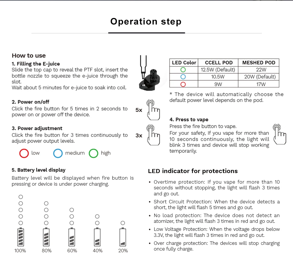 Фитинг sub-ohm и MTL vaping 5 уровней LED Батарея индикация Автоматически распознает катушку для уменьшения сухого удара В 5 раз больше контактной зоны для более быстрого нагрева и более насыщенных вкусов PTF-on-top в сочетании со скользящей верхней крышкой еще больше повышает безопасность детей.