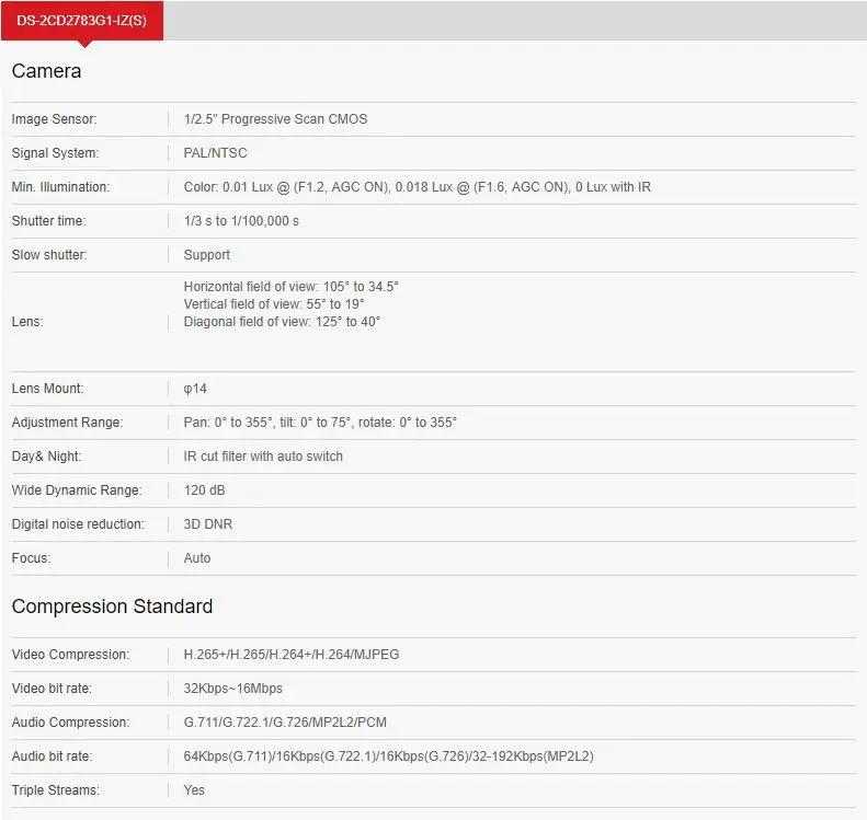 • Цвет: 0,01 лк @ (F1.2, AGC ON), 0,018 лк @ (F1.6, AGC ON), 0 Люкс с ИК