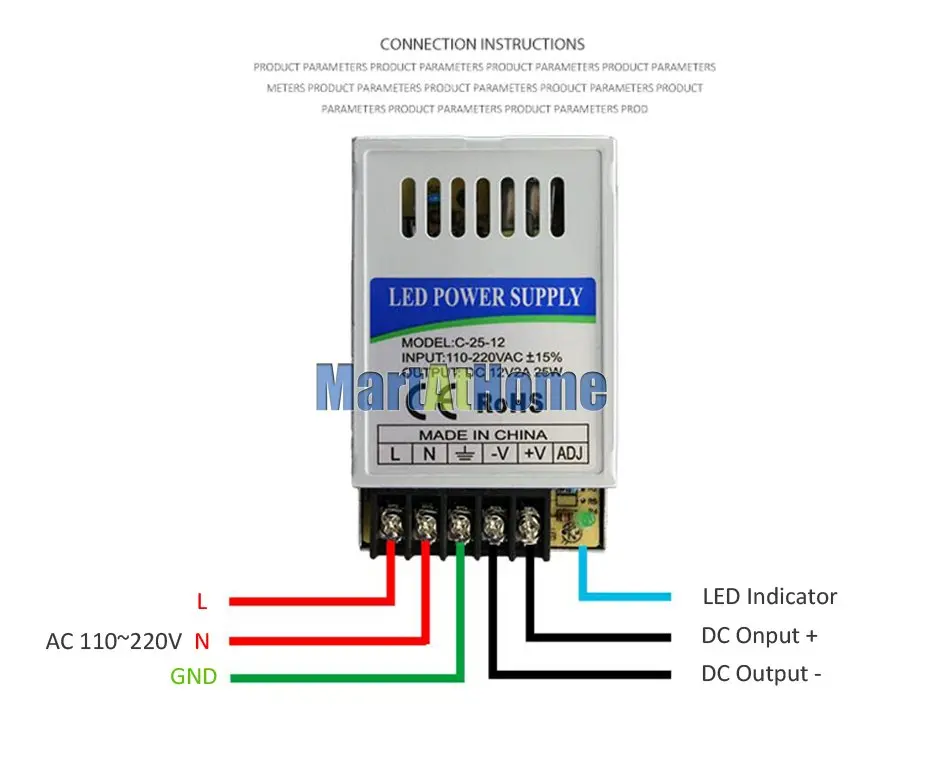Входное напряжение: переменный ток 110 ~ 220 В Выходное напряжение: DC12V Выходной ток: 0 ~ 2.1A Размер продукта: 48*78*20 мм Эффективность: 85%