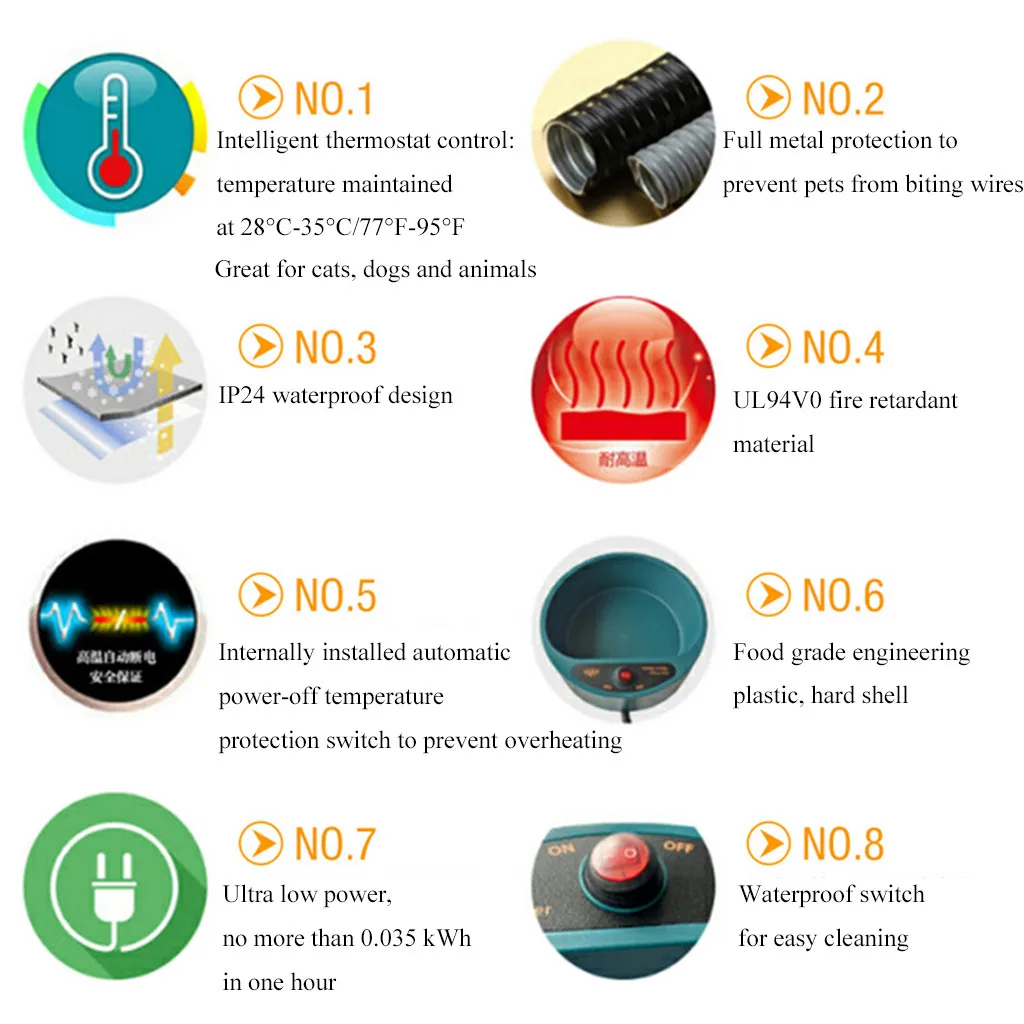 3. безопасные детали: термостатическая интеллектуальная система отопления (предотвращает замерзание воды или слишком нагревание при работе); нержавеющая сталь анти-укуса трубки; укуса устойчивый материал чаши, сертификация CE, 4. roHS и CNAS; водонепроницаемый выключатель и индикаторный светильник.