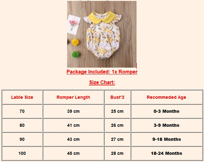 Размер ярлыка Длина комбинезона Бюст * 2 Рекомендованный возраст 70 39 см 25 см 0-3 месяца 80 41 см 26 см 3-9 месяцев 90 43 см 27 см 9-18 месяцев 100 45 см 28 см 18-24 месяца