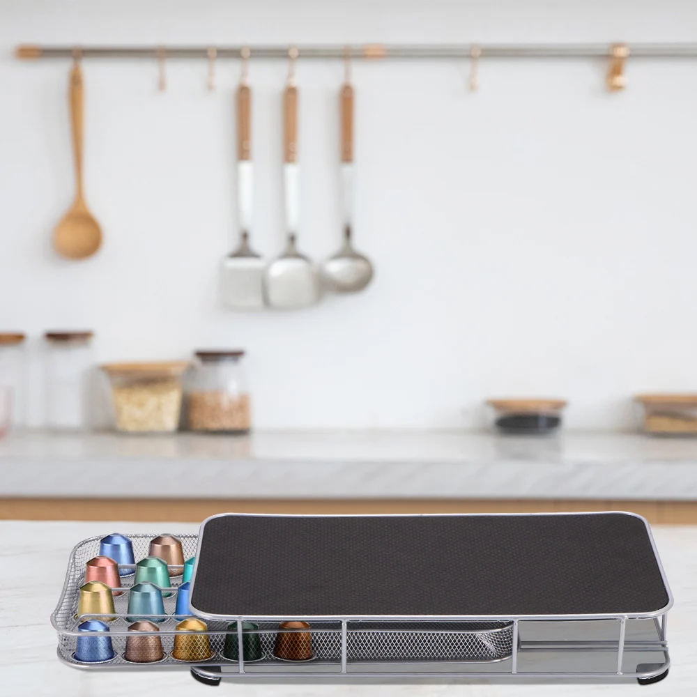 Ящик для кофейных капсул разработан с четырьмя противоскользящими накладками на дне и ковриком EVA на его верхней части, чтобы обеспечить стабильность ящика кофейных капсул и предотвратить скольжение вверх кофемашины.