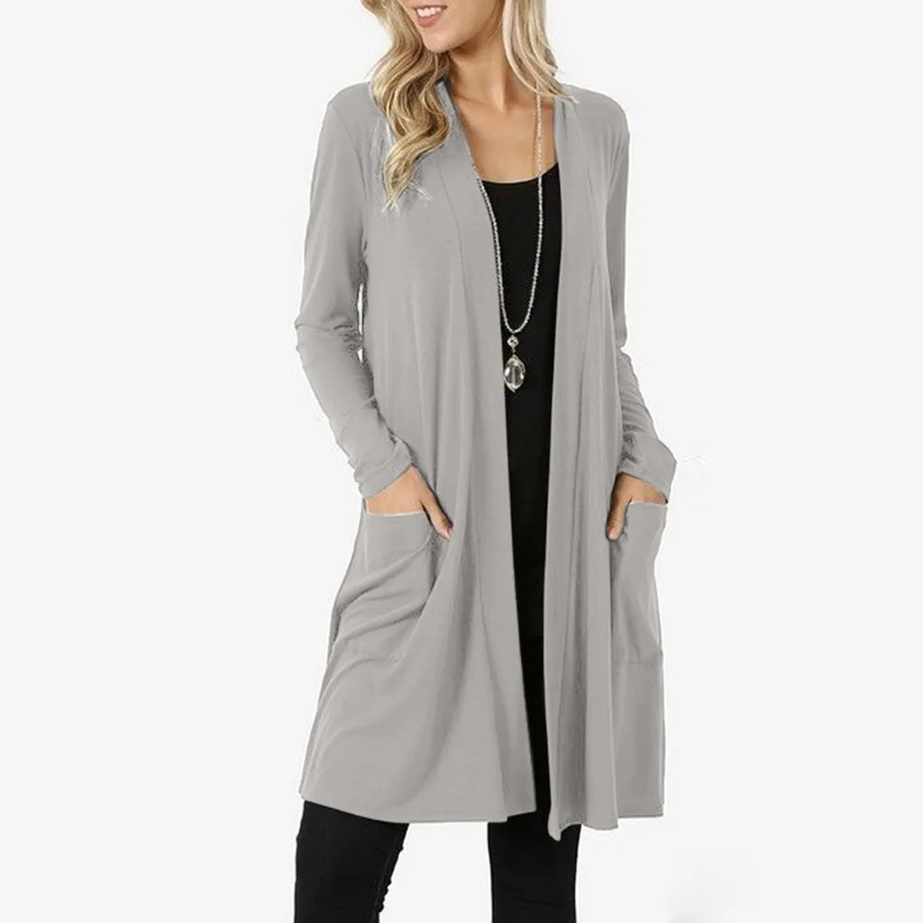 Женский Повседневный однотонный Кардиган с длинным рукавом, открытый передний свободный легкий кардиган кимоно, пальто с карманами