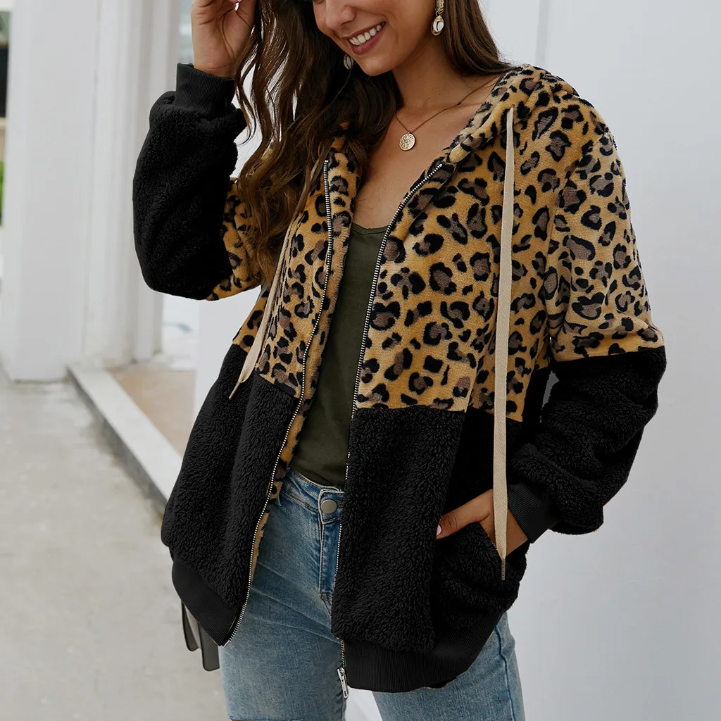 Женский леопардовый принт пэтчворк, флисовый кардиган с длинными рукавами на молнии, теплое пальто