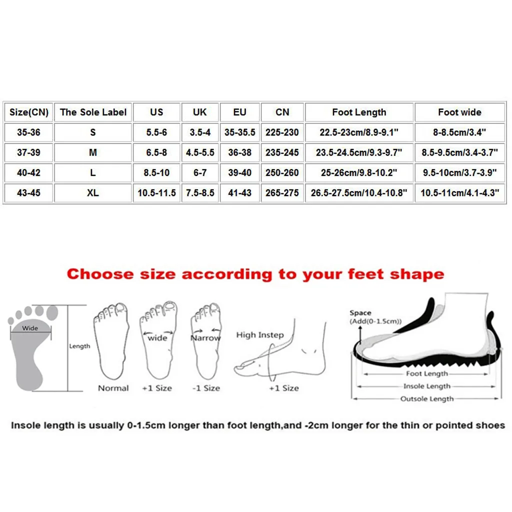 Size(CN) The Sole Label US UK EU CN Foot Length Foot wide 35-36 S 5.5-6 3.5-4 35-35.5 225-230 22.5-23cm/8.9-9.1" 8-8.5cm/3.4" 37-39 M 6.5-8 4.5-5.5 36-38 235-245 23.5-24.5cm/9.3-9.7" 8.5-9.5cm/3.4-3.7" 40-42 L 8.5-10 6-7 39-40 250-260 25-26cm/9.8-10.2" 9.5-10cm/3.7-3.9" 43-45 XL 10.5-11.5 7.5-8.5 41-43 265-275 26.5-27.5cm/10.4-10.8" 10.5-11cm/4.1-4.3"