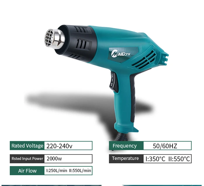 Напряжение: 220 В Мощность: 2000 Вт Поток воздуха прибл. Для шага 1: 250 л/мин Поток воздуха прибл. Для шага 2: 550 л/мин Вес: 0,9 кг Температура первой передачи: 350 градусов по Цельсию Вторая температура: 550 градусов по Цельсию