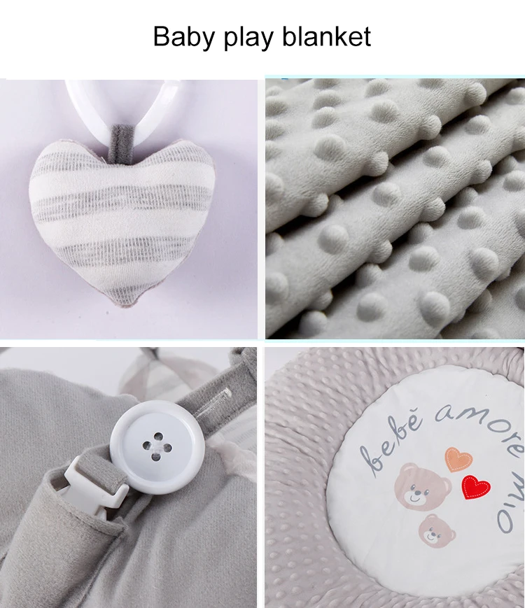 1. Это блестящий роскошный игровой коврик. Игровой коврик можно сложить, чтобы вернуться в сумку для хранения. Игрушки безопасны, развиваются и предназначены для стимуляции зрения, слуха и тактильности, так как у них скрип, погремушка и зеркало.