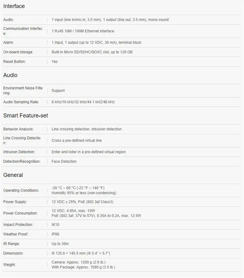 • Цвет: 0,01 лк @ (F1.2, AGC ON), 0,018 лк @ (F1.6, AGC ON), 0 Люкс с ИК