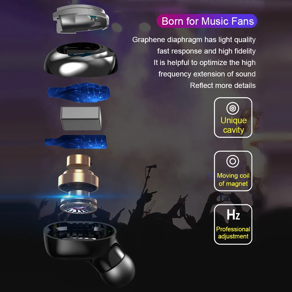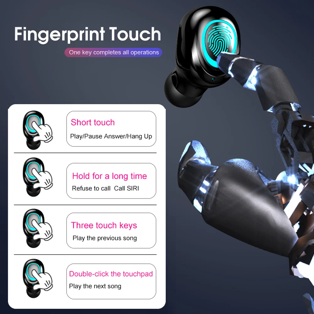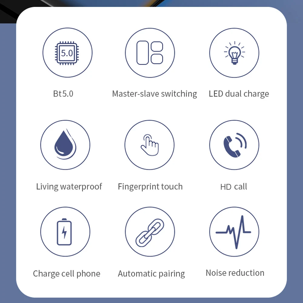 Технология BT 5,0 обеспечивает высокую скорость передачи данных, стабильную производительность и низкое энергопотребление. С технологией TWS каналы левого и правого уха разделены. Вы можете использовать гарнитуру исключительно или использовать их парами. Зарядное устройство емкостью 3500 мАч обеспечивает магнитную зарядку гарнитуры и может работать как мобильный источник питания. Светодиодный экран с цифровым дисплеем показывает емкость аккумулятора зарядного устройства и наушников. Встроенный двойной микрофон с функцией шумоподавления обеспечивает более четкий и реальный говорящий звук. Его мини-размер и вес 4 г каждого наушника хорошо прилегают к ушному каналу и гарантируют стабильность и комфорт при занятиях спортом.