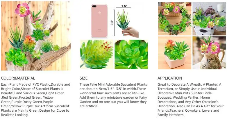 Материал-высокое качество ПВХ-пластика, из-за ручной работы этого товара и в зависимости от наличия продукта, каждое растение уникально, но высокое качество, размер и стиль гарантированы! Стандартный размер, большинство из суккулентные растения размер составляет около 4-9 см/1,5 "-3,5" в ширину, Миниатюрный Сад разнообразны. Префект для вас-они идеально подходят для тех, кто хочет выглядеть красивым сочным садом, но не хочет, чтобы они были живы! Это выбор и очень реалистичный вид. Широкое применение-отлично подходит для домашнего офисного декора стола, Используйте его для украшения венка, плантатора, террариума или просто используйте в отдельных декоративных мини-горшках.