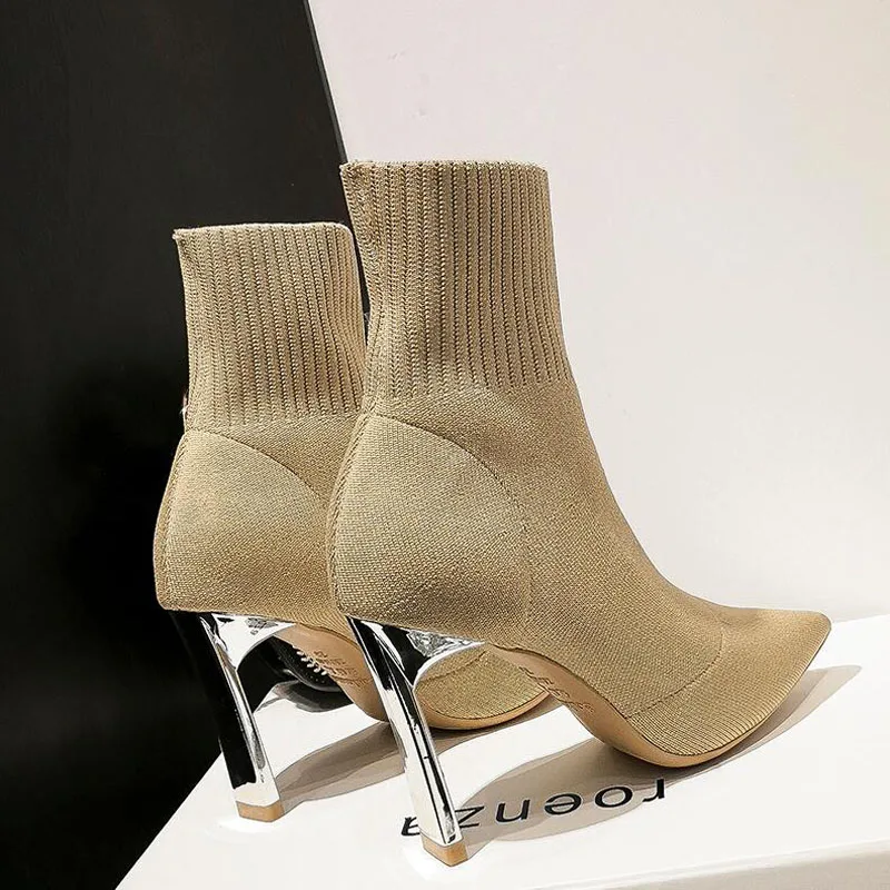 Эластичные вязаные ботильоны; Модные женские зимние вечерние туфли с острым носком без застежки; Пикантные Необычные модные ботинки на высоком каблуке 8 см