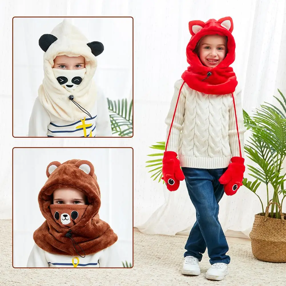 Детский Теплый шарф с капюшоном, детский плотный флисовый зимний шарф, шапка с ушками, лыжная шапка с изображением панды для девочек и мальчиков