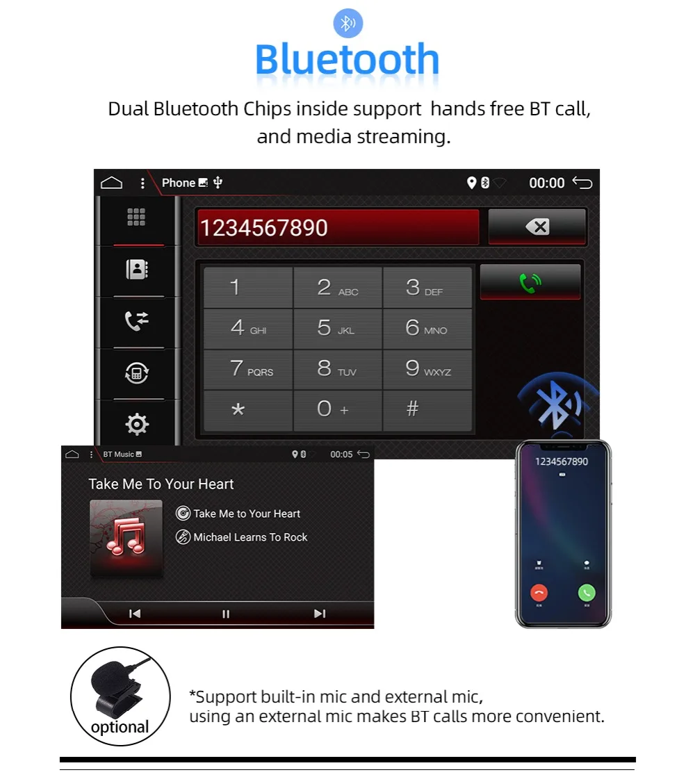 11. Функция Bluetooth: Встроенный Bluetooth 4,0 бесплатно/Телефонная книга, поддержка Bluetooth MP3-плеера.