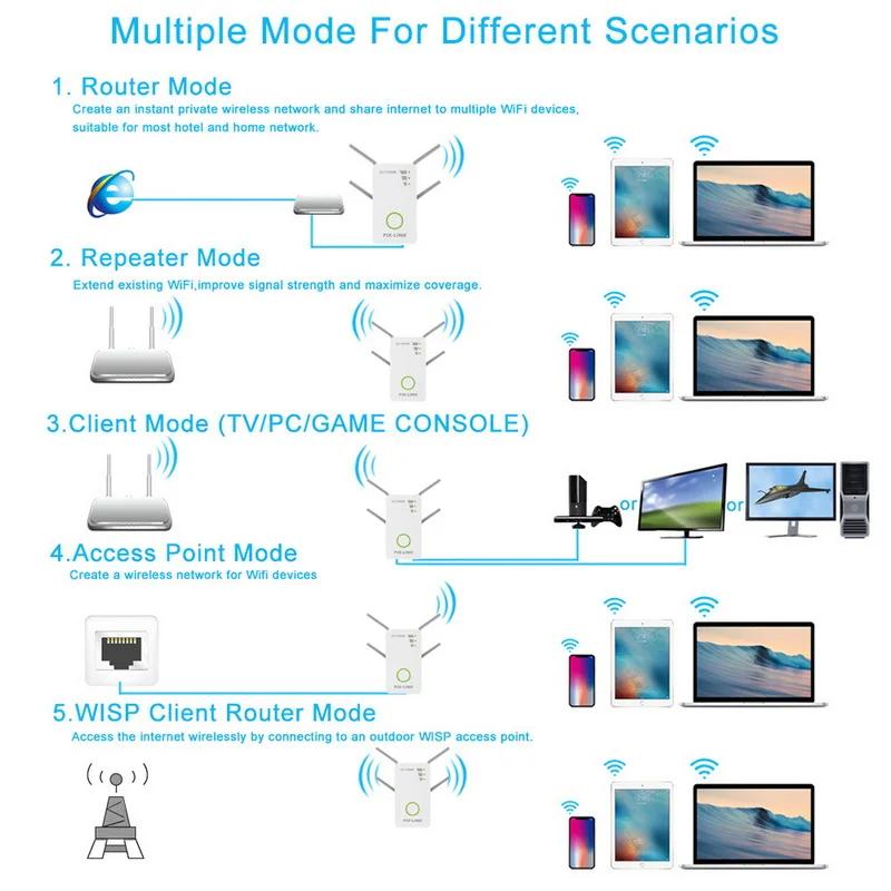 << Multi working modes: Supports router, client-side, repeater,AP mode and WISP mode.