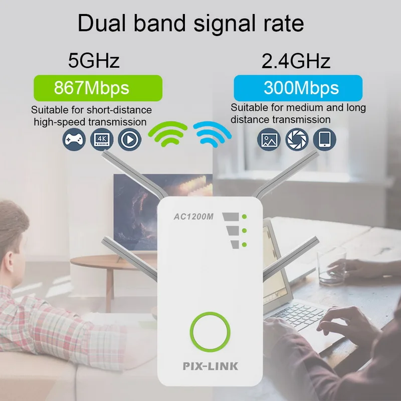 << Stable signal boosts: Dual band technology, it offers up to 300Mbps for 2.4GHz and 867Mbps for 5GHz.