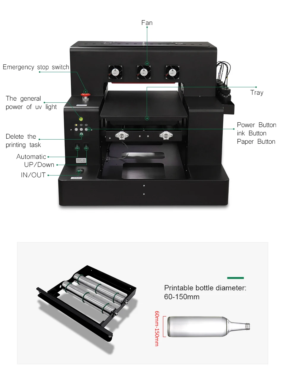 2. Бутылки для печати (диаметр: 60 мм-150 мм), с бесплатным держателем для бутылок