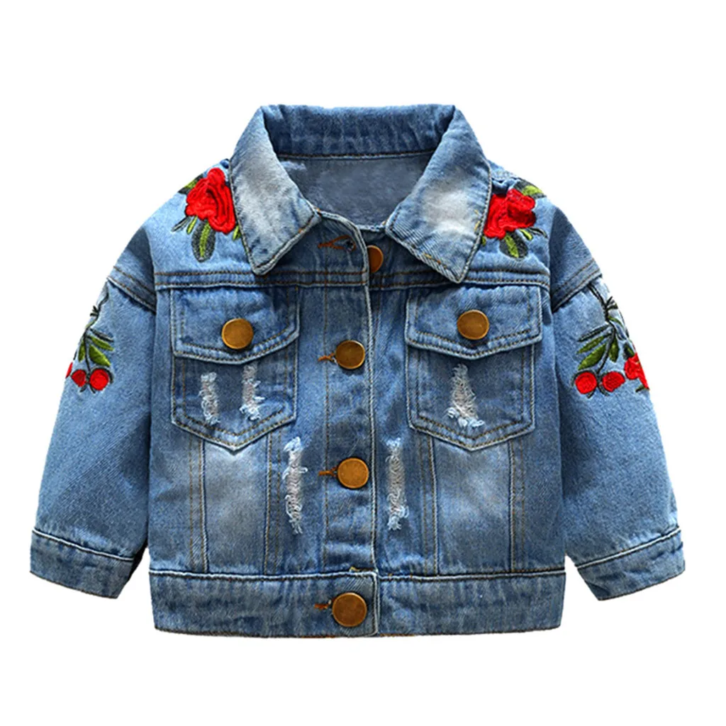 Ветронепроницаемое джинсовое пальто с длинными рукавами и вышивкой розы для маленьких девочек; Верхняя одежда