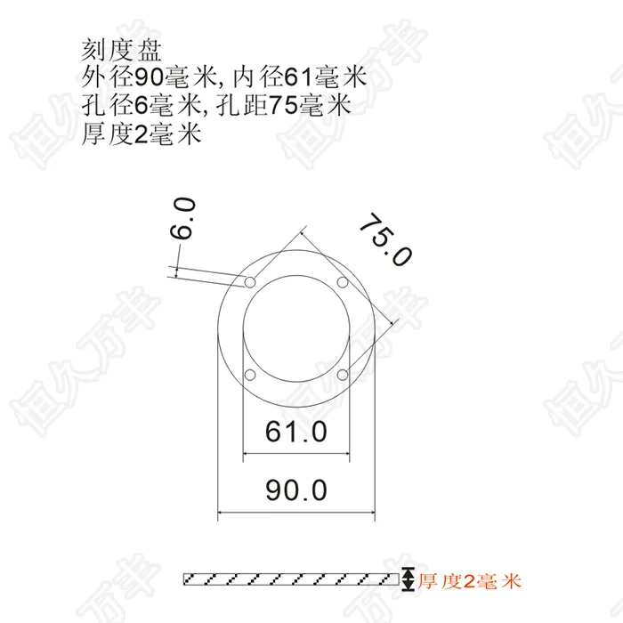Внешний диаметр: циферблат 90 мм с отверстием для циферблата, Позиционирование отверстия, угол циферблата 90 #61 #2 #6 #75 Материал; Нержавеющая сталь 201 Внешний диаметр; 90 мм Внутренний диаметр; 61 мм Толщина; 2 мм Апертура 6 мм Шаг отверстия 75 мм