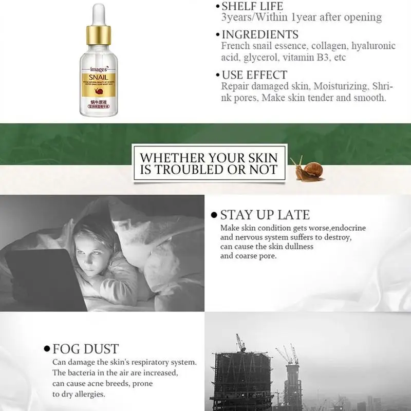 Описание: Информация о продукте: тип кожи: общий срок годности: 3 года содержание нетто: 15 мл оригинальная жидкая Улитка может увлажнять и отбеливать, смягчать и смягчать, сужать поры, увлажнять и контролировать масло, инструкции по осветлению тона кожи для использования: 1. После очистки кожи нанесите на лоб, щеки, Подбородок и нос. 2. Аккуратно распределите лицо кончиками пальцев, затем массируйте кожу до тех пор, пока не впитывается. Меры предосторожности: 1. Для чувствительной кожи сначала проверьте внутреннюю часть руки, если нет дискомфорта, используйте его. 2. Если у вас есть аллергическая реакция, немедленно прекратите ее использование и обратитесь за помощью к дерматологу. 3. Если продукт случайно попадет в глаза, немедленно промойте глаза. Включает в себя: 1 жидкость для хранения улиток/p>