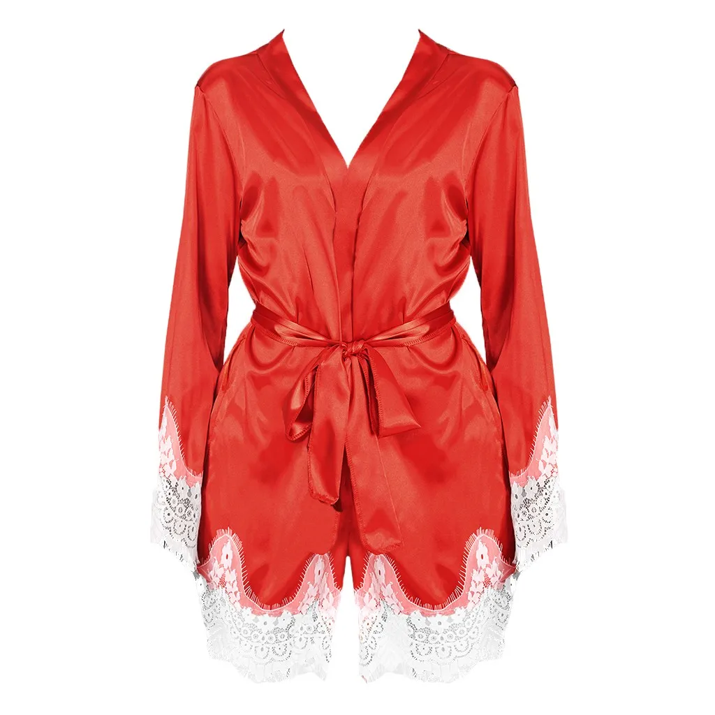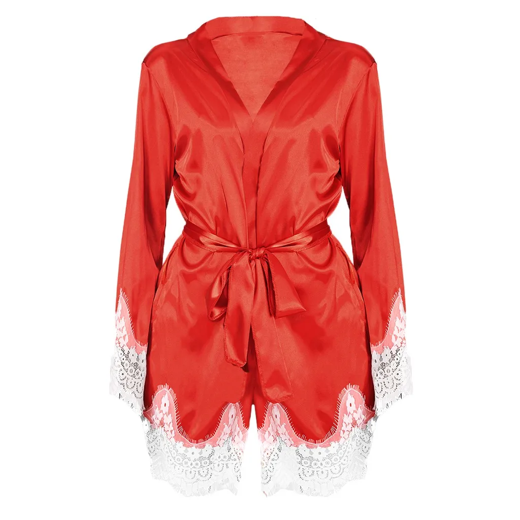 Новые женские кружевные шелковые с длинным рукавом атласные пижамы халат с поясом халат
