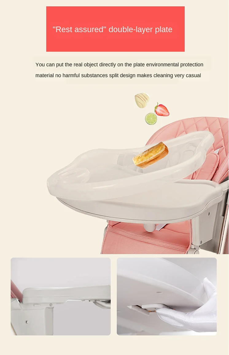 1. Анатомическая форма сиденья, которая гарантирует необходимую поддержку спины и комфорт для вашего ребенка высокий стул 3 положения Регулируемая подставка для ног 2,3-положение сиденья кресла отрегулировать 3-позиционная регулируемая пластина имеют два слоя и легкоочищающийся 3,7-позиции регулируемой длины высокого для того чтобы одеть вы и ваш ребенок стульчик для кормления 4,5-позиции регулируемой спинкой для детского питания и сна 5,5 точечный ремень безопасности надежно удерживает вашего ребенка 6. Четыре колеса с одной ключевой тормозной системой для обеспечения высокого качества безопасности