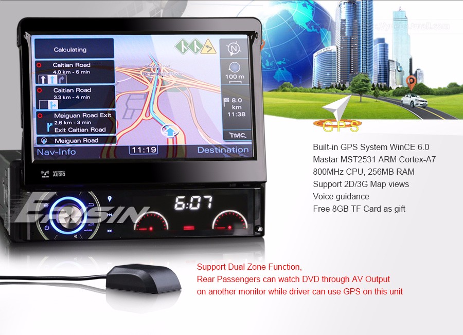 -Поддержка gps-навигации, Бесплатная карта TF 8 ГБ и GPS антенна в комплекте.