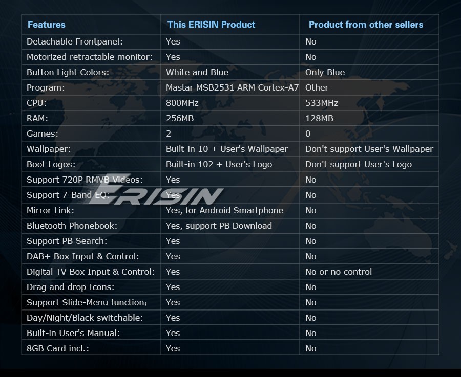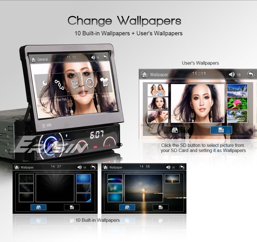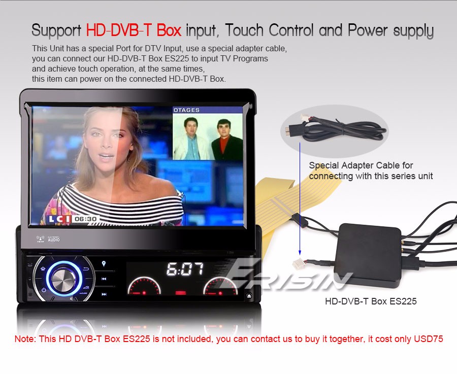 7 дюймовISO 1 DinУниверсальный дизайн с моторизованным выдвижным монитором и съемной передней панелью, принимаетсяMastar MST2531 ARM Cortex-A7 процессор 800 МГц, ОЗУ 256 МбПоддержка720PВидео RMVB, управление музыкальным проигрывателем в главном меню, встроенная система DAB +, просто подключите к нашемуDAB + Box ES355 (стоит 38 долларов США)Для использования этой функции. Поддержка внешнийЦифровая ТВ-приставка (ES338-L опция)Вход + блок питания + сенсорное управление, Bluetooth PB-загрузка и PB-поиск, управление рулевым колесом, встроенный 2 игры, 102 логотипа загрузки, и вы можете обновить Изображение пользователя с sd-карты, 10 внутренних обоев, и вы можете обновить обои пользователя, переключаемый режим «День/Ночь/Черный», 7-Band-EQ и пользователь, стандарт, поп, мягкий, кинотеатр, Металл, рок, классика, джаз регулируемый, поддержка зеркальной связи с Android смартфоном