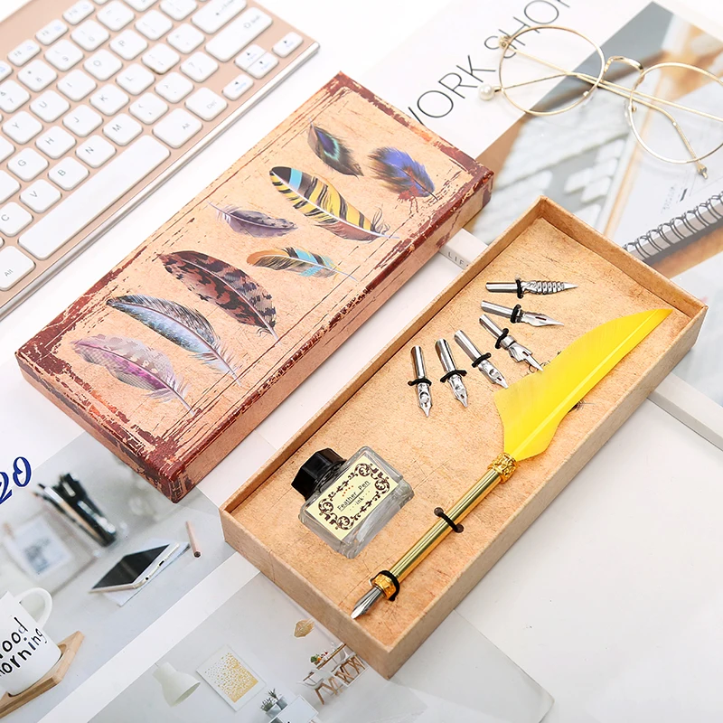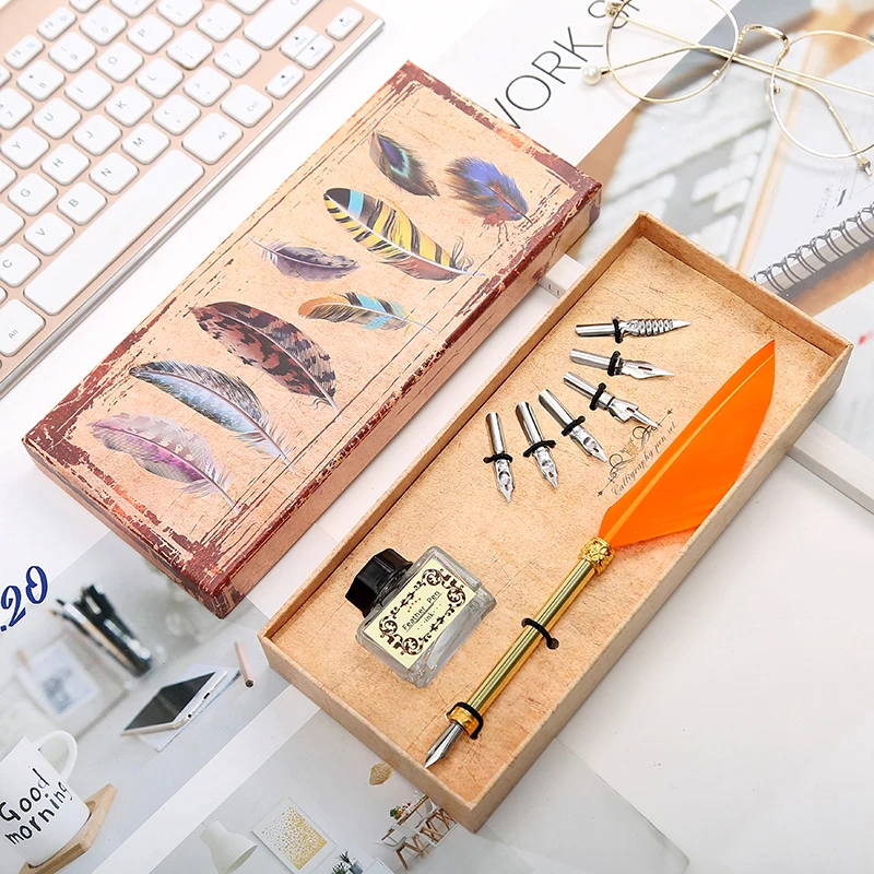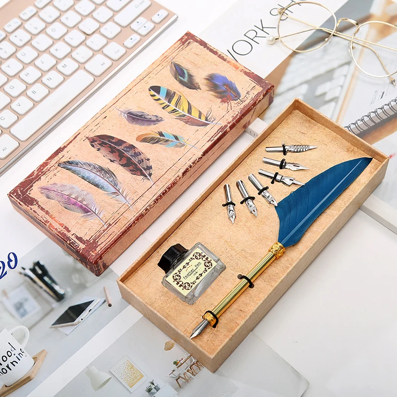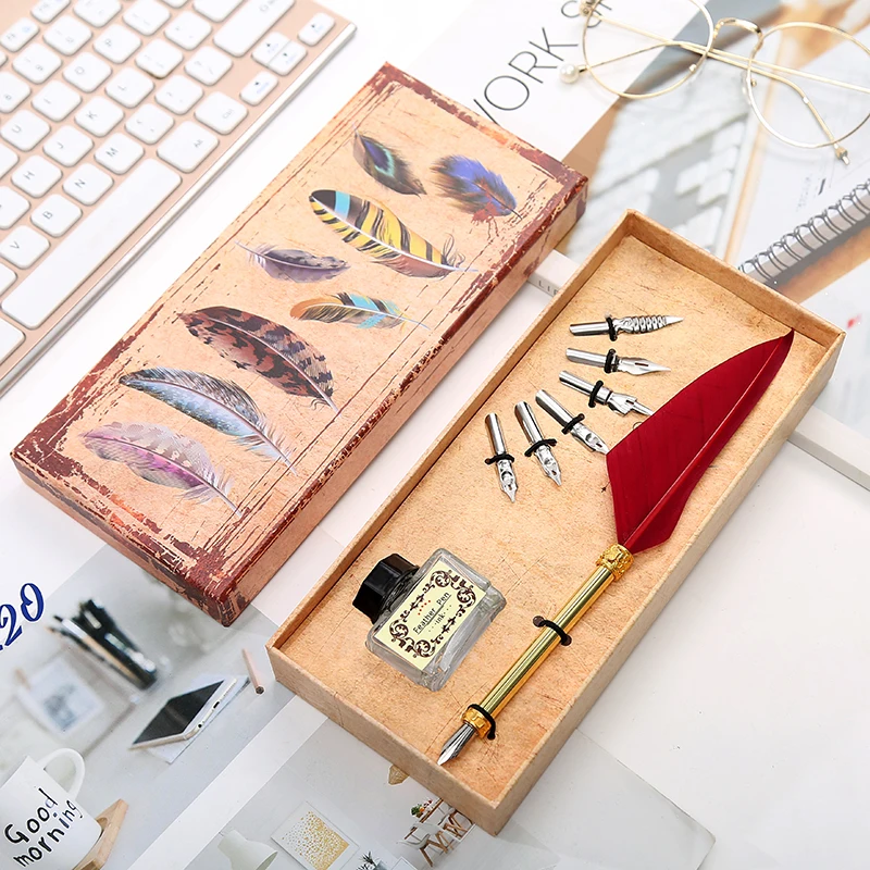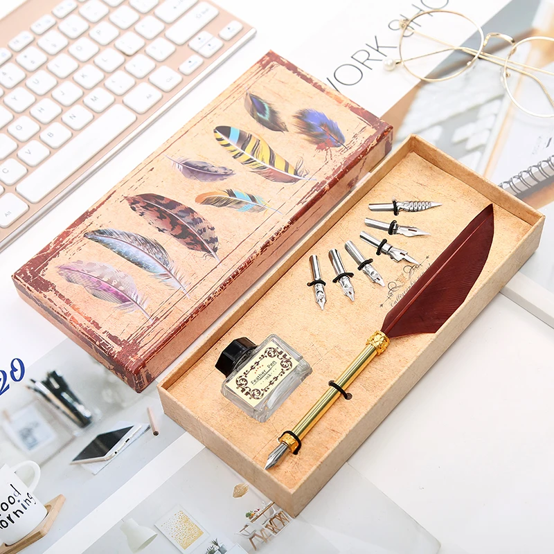 1 Set Of English Calligraphy Feather Dip Pen 6 Nib Writing Stationery Set Gift Box Student Writing Stationery