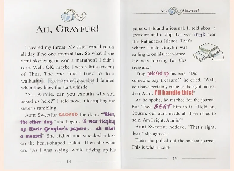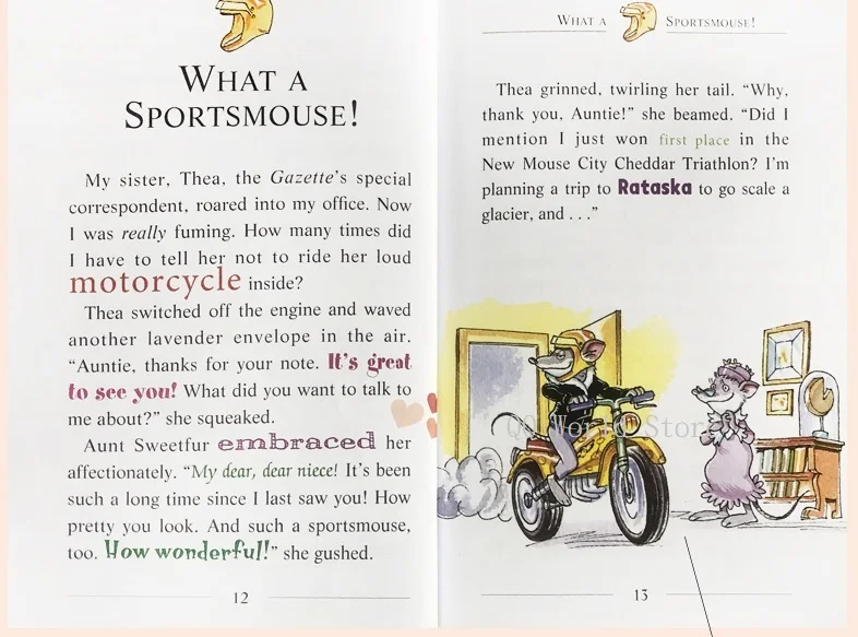 Кроме того, серия Geronimo Stilton полна юмористических и ярких иллюстраций и креативного дизайна макета. Взгляд на каждую книгу будет привлекаться не только красивыми иллюстрациями, но и тусклым и неинтересным расположением персонажей в книге, но богатством и очарованием картины. Такой дизайн, несомненно, обеспечивает больше удовольствия для чтения для детей-читателей, чье мышление изображения является преобладающим.