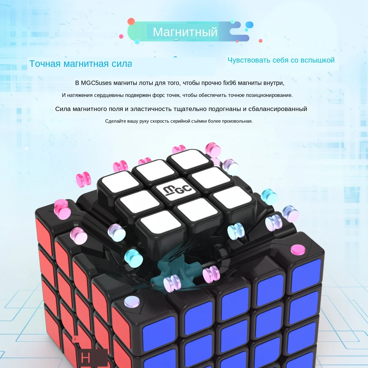 Название продукта: YJ MGC 5x5x5 куб (магнитная версия) Цвет: черный, без наклеек Вес нетто: 135 г Размер куба: 62 мм * 62 мм * 62 мм Ps. Уилл поставляется в собранном, наклеенном и хорошо смазанном виде и в бумажной коробке.