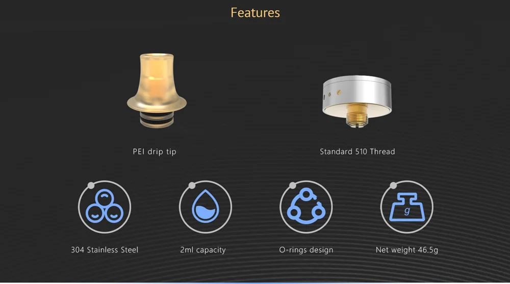 Материал: 304 нержавеющая сталь Размер: 22 мм * 41 мм Ёмкость: 2 мл Капельный Наконечник: 810 PEI капельный наконечник Положительный штырь: латунь позолоченная Нить: 510