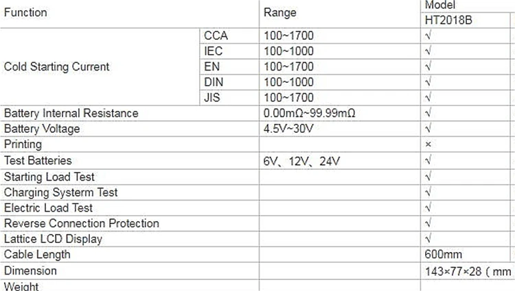 Проверьте состояние автомобильной нагрузки напрямую. Проверьте Стартовое Напряжение автомобиля. Проверка напряжения зарядки автомобиля, как правило, или нет. Низкочастотное Тестирование сигнала без внешней большой нагрузки, тест диашаржа. Легко считывает электрическую емкость и физические состояние для оценки срока службы. Непосредственно обнаружите на автомобиле, не снимая аккумулятор. Быстро и точно отображает результаты тестирования батареи. Непрерывная работа, полная защита от перенапряжения и защита обратного соединения. Нет электричестве, нет жара, нет искры, нет операционной опасности, в основном все взрослые могут это сделать. Тест на батарею: холодный пусковой ток, внутреннее сопротивление батареи и напряжение, жизненный цикл. Стартовый тест: изменение состояния батареи во время запуска системы. Тест системы: Выходное состояние во время работы зарядной системы. Проверка максимальной нагрузки: состояние максимальной нагрузки батареи. Область применения: производитель аккумуляторов для хранения, линия производства автомобилей, ограниченная серия автомобильных батарей, дистрибьютор аккумуляторов для хранения и владелец грузовиков, прейсивный автомобиль.