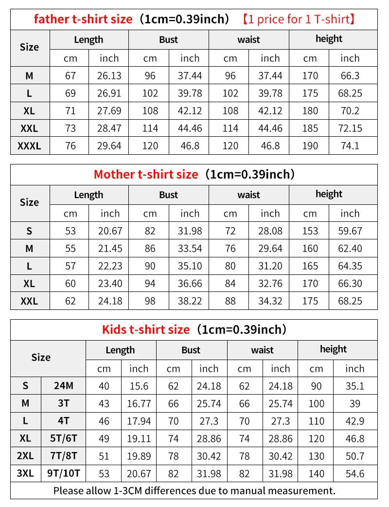 Note : Dad mom and kids t-shirt are of different prices. One price for one Sweatshirt Product Name : Sweatshirt Weight : About 0.2kg-0.4kg / pcs Packaging : 1 pcs packed in 1 bag Color : red, black, Dad size : M-L-XL-XXL-XXXL Mom size: S-M-L-XL-XXL Kids size : baby romper, 2(24M), 4(3T/4T), 6(5T/6T), 8(7T/8T), 10(9T/10T)