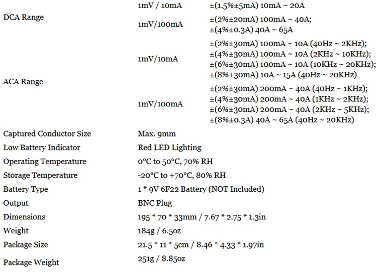 Это преобразователь, который позволяет вашему мультиметру измерять текущие данные и позволяет осциллографу измерять текущие формы волны. При измерении переменного/постоянного тока с помощью токового зажима мультиметр или прицел могут напрямую измерять ток до 65А, с частотой uo до 20 кГц. В соответствии с этим методом, нет необходимости сломать цепь или повлиять на изоляции для измерения тока.