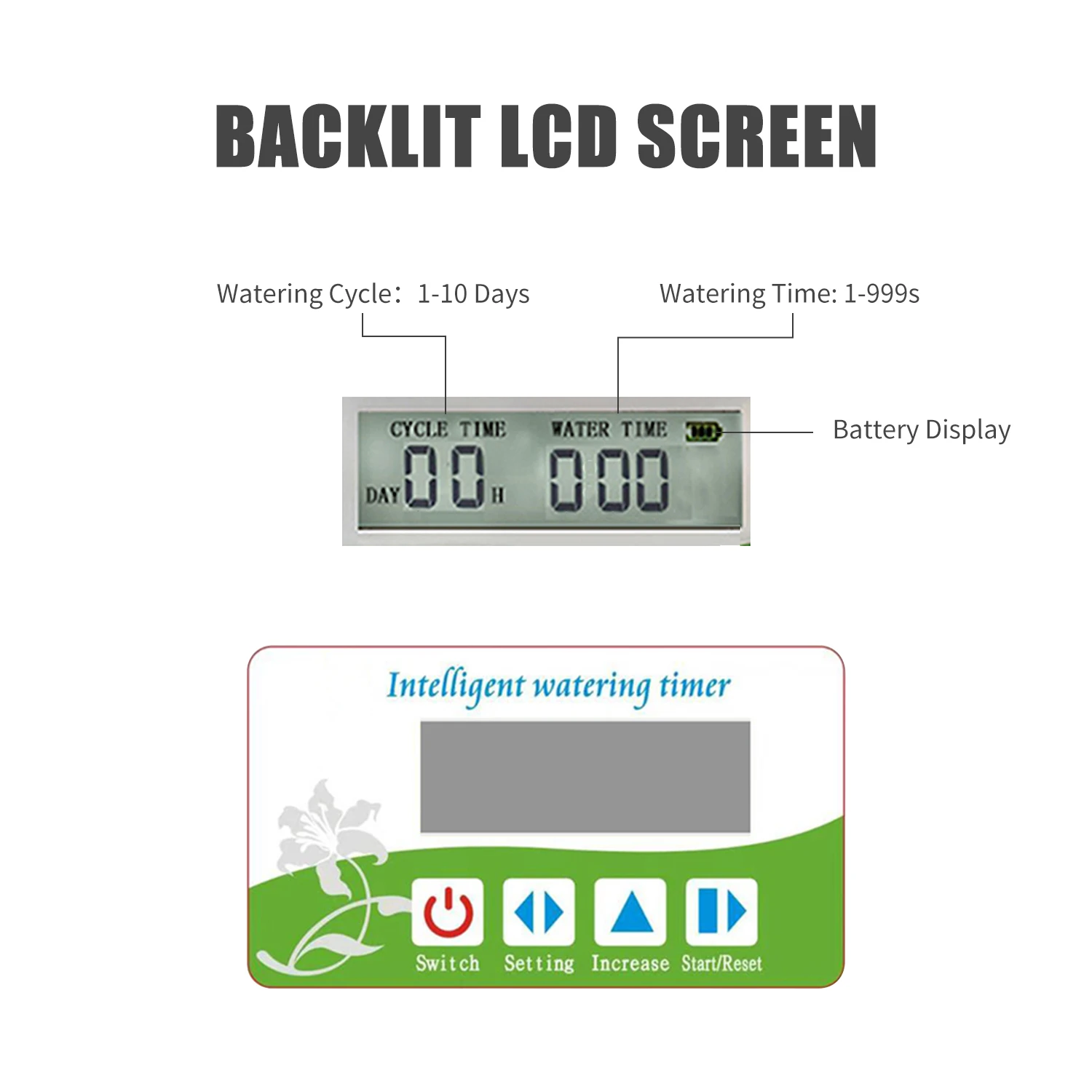 [Контроль полива]Интервальный диапазон времени 1-10 дней и диапазон времени полива 1-999 секунды в одной автоматической системе полива.