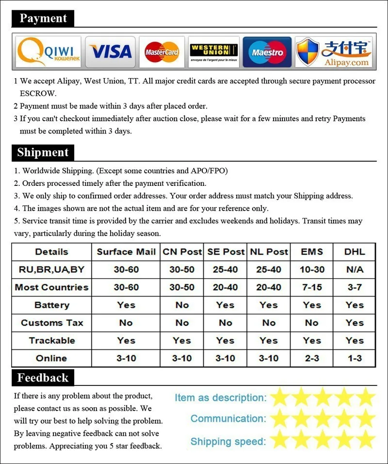 4. Когда вы получаете продукт, если вы чувствуете себя удовлетворенным, пожалуйста, дайте нам пять звезд высокой оценки; Если вы не удовлетворены, пожалуйста, свяжитесь с нами в первый раз. Мы постараемся сделать все возможное, чтобы решить эту проблему до достижения удовлетворительного результата.