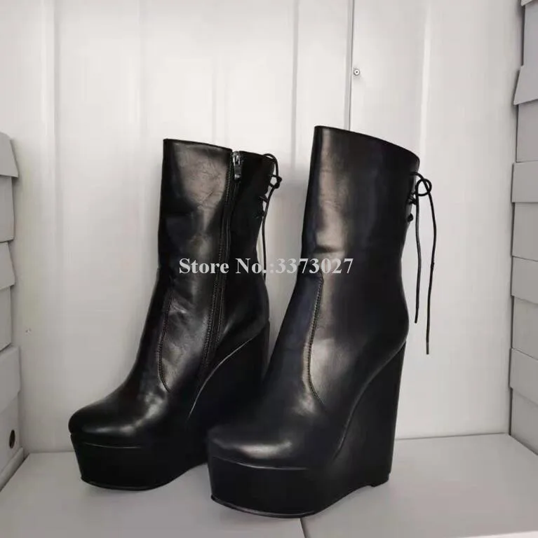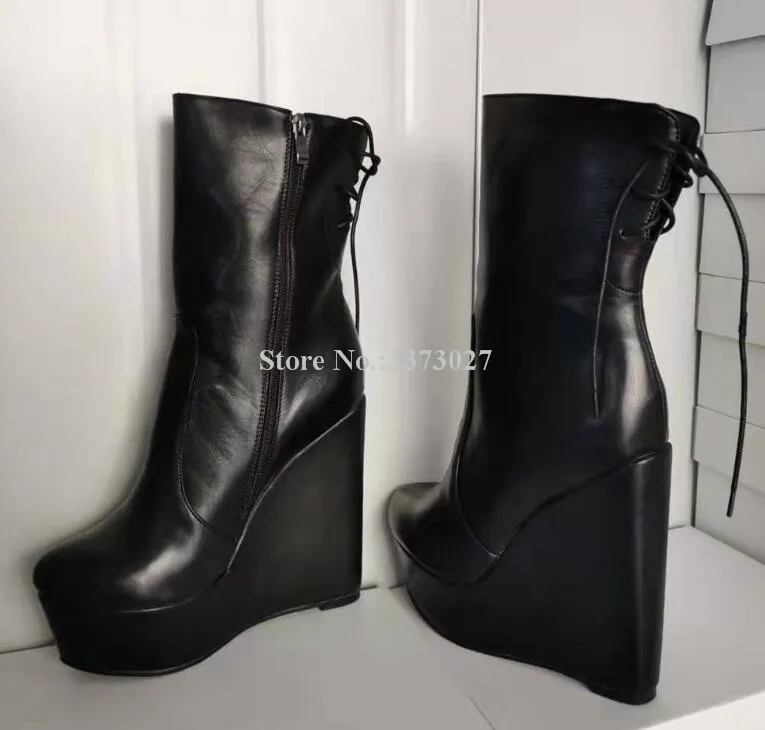New Black Leather Platform Wedge Ankle Boots Women Sexy Back Lace-up Zipper Short Boots Lady Real Photos Dress Party Shoes Dropship